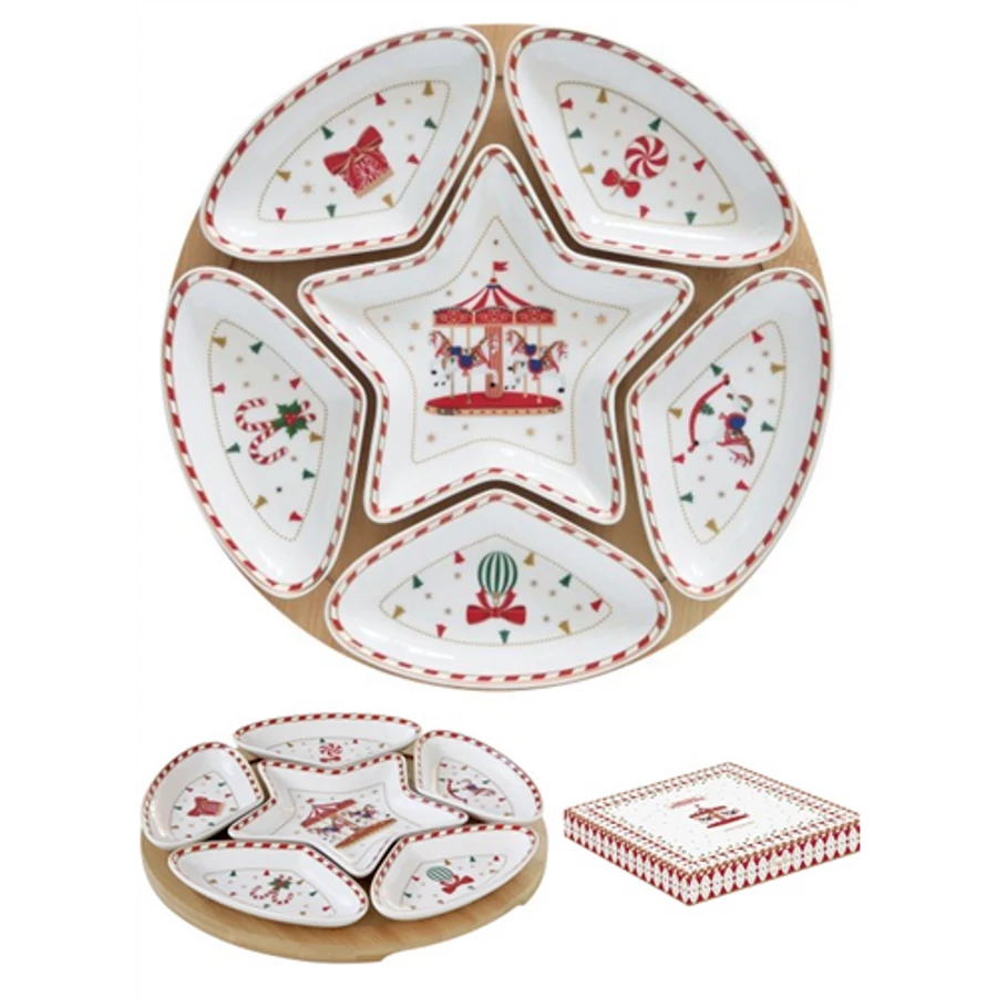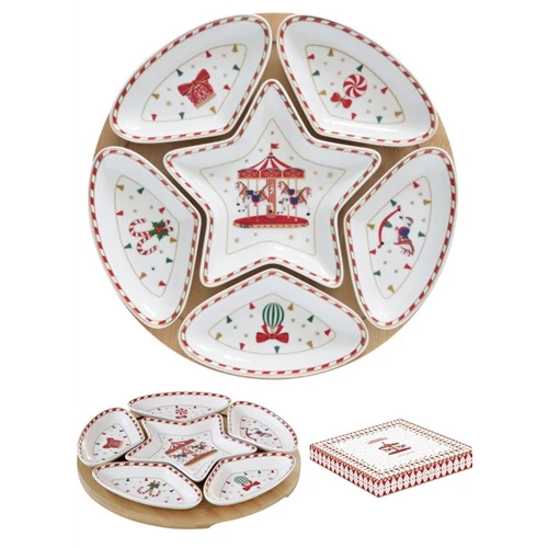 R2S.2190CHWO Fenyőfa porcelántálszett 3 részes, bambusztálcán 21x25cm, dobozban, Christmas Wonderland